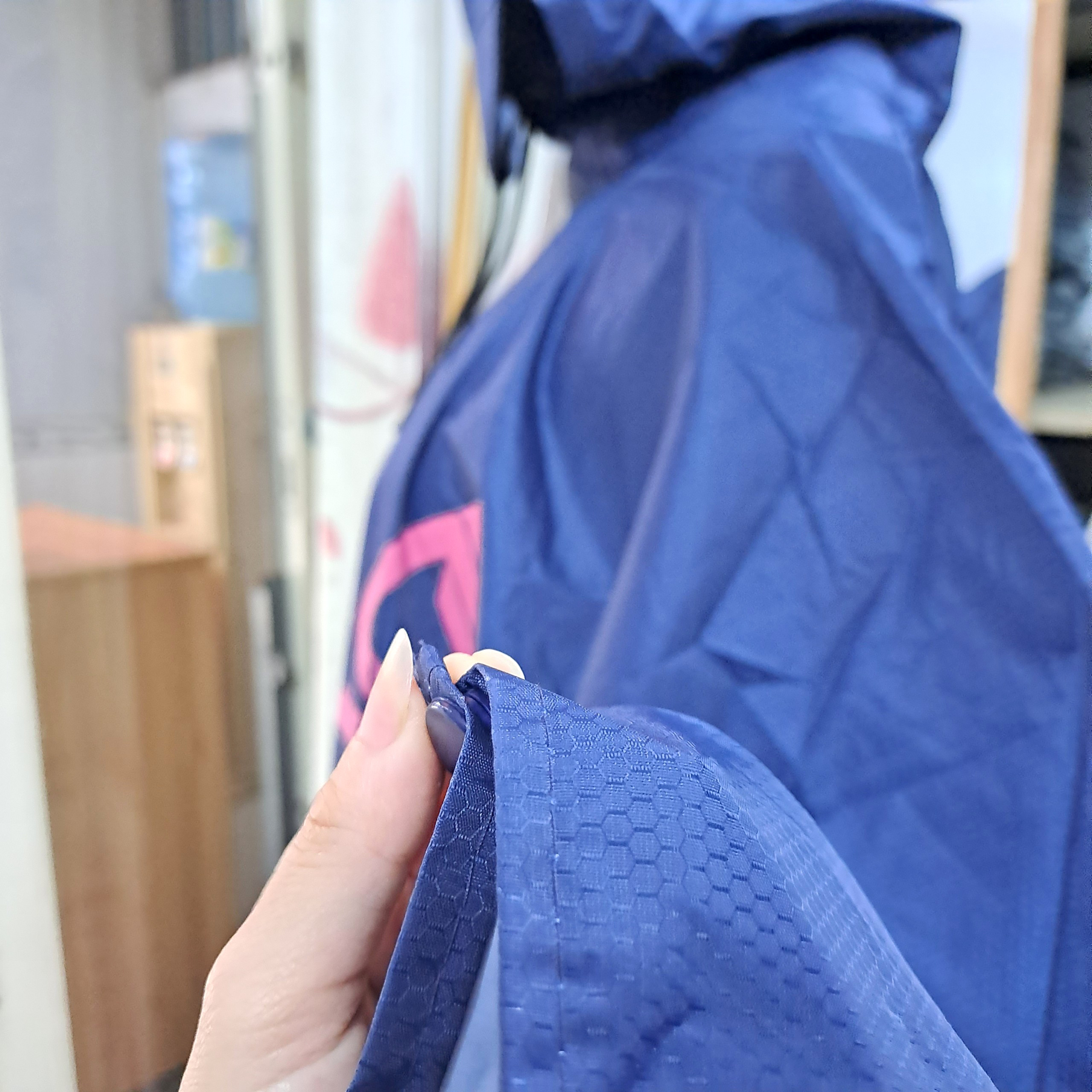 - Mũ trùm có vành rộng, phần lưỡi trai cứng, giúp hạn chế nước mưa tạt vào mặt và chảy xuống cổ áo.